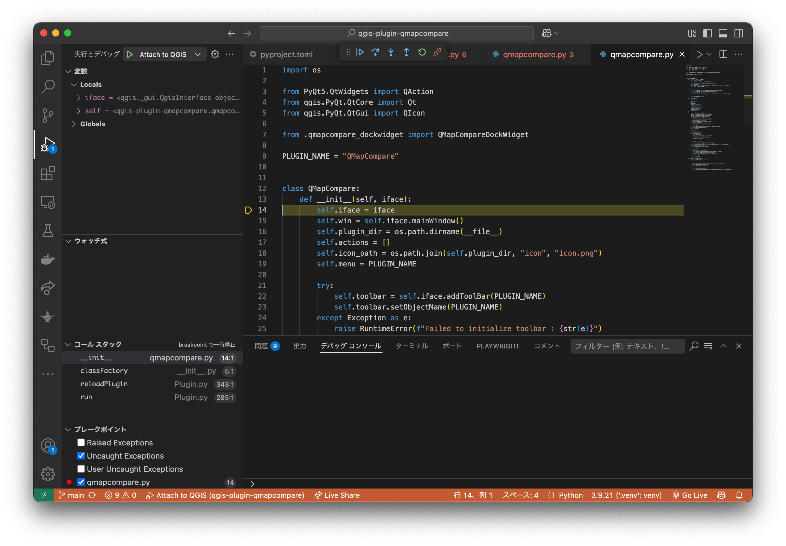 今回は起動時の動作を見たかったので QMapCompareの__init__の中にブレイクポイントを仕掛けてから、プラグインリローダーを使ってプラグイン自体のリロードをしてみます。